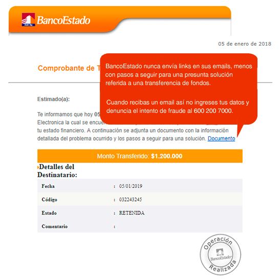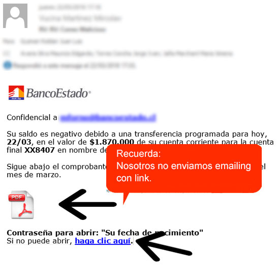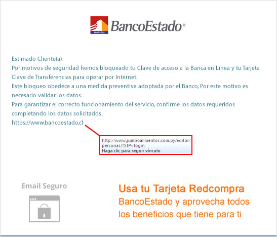 BancoEstado nunca envía links en sus e-mails. Los correos falsos, phishing, contienen links que llevan a páginas que roban tus claves.